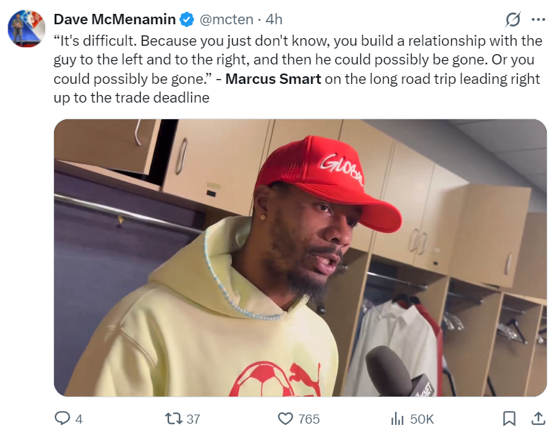 赛后斯玛特也谈到了即将到来的交易截止日,他说道:这很难,因为刚来球队没多久才跟某些队友建立了联系他们可能就要离开了,当然也有可能是我离开。